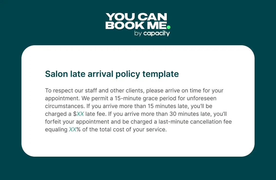 - Set clear expectations with customers:: A well-crafted policy will help you have consistent communication across your entire client base around what your expectations are when they book an appointment (and the consequences if they don’t meet those expectations).
